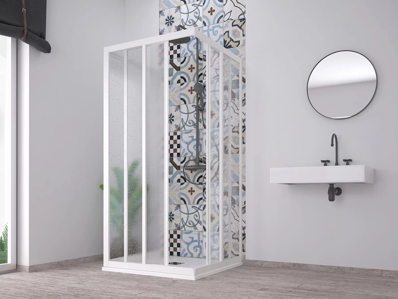 SKILL box doccia 3 lati cm. 70x70x70 h190,2 reversibile – riducibile cm. 70-65 – installazione centrostanza a parete con lato fisso cm. 67-70 – acrilico spessore 1,8 mm. semitrasparente effetto bagnato – profili pvc bianco pastello semilucido