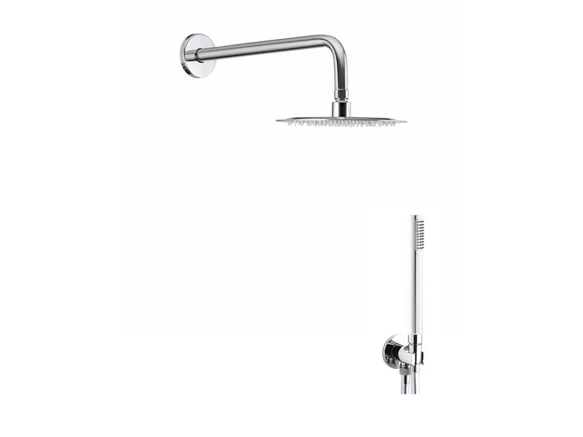 MEL kit doccia tondo composto da braccio l.350 mm,soffione ultrathin inox ø250 mm, flessibile silver in pvc lunga durata mt.1,50 con raccordo antitorsione,presa acqua duplex con supporto doccia in ottone cromato e doccia in abs cromato ø32 cm