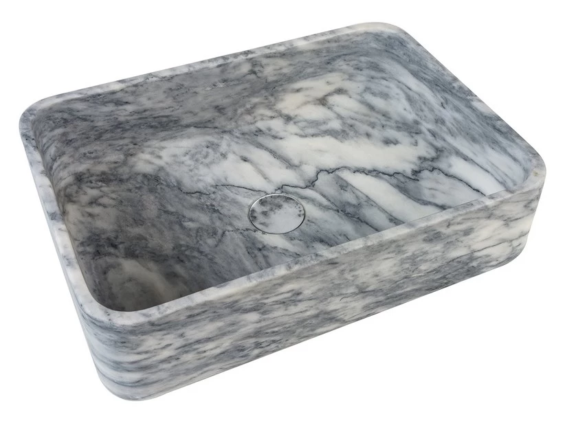STATUARIO Lavabo in marmo massiccio 45,5×32,5x13h cm con sfumature di bianchi e grigi che si rincorrono in questo marmo pregiato dando vita a disegni naturali affascinanti. Scavato da un solo blocco garantisce unicità e raffinatezza. Piletta con copripiletta coordinata inclusi. Finitura STATUARIO BIANCO