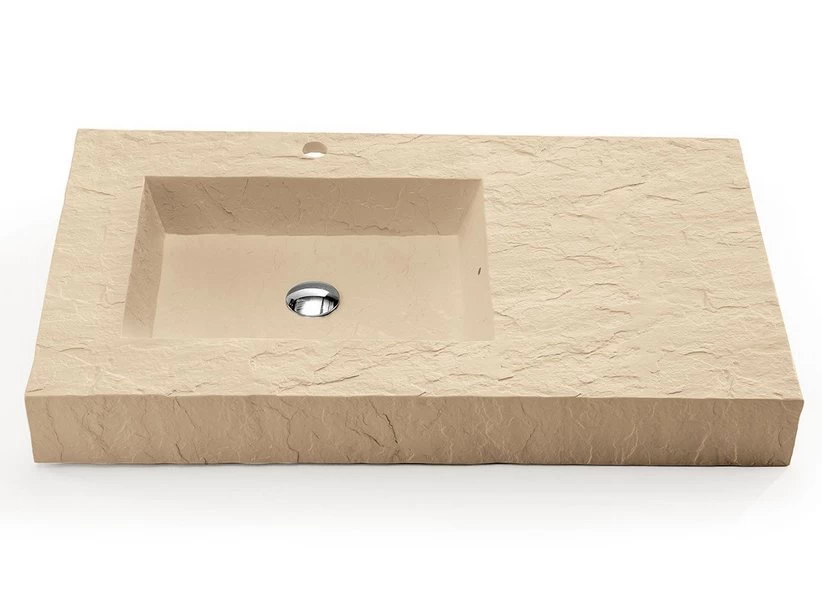 Lavabo d’arredo TOP SLATE 90 cm. 91x51xH10 vasca sinistra – installazione in appoggio o sospesa – forma rettangolare con foro rubinetto – con foro troppo pieno – resina & marmo crema marfil