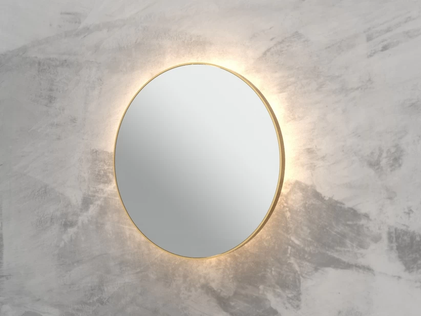 QUEEN Specchiera Tonda retroilluminata a LED con luce naturale 4000°K, cm Ø60 cornice spessore 5 mm in acciaio verniciato oro opaco – staffa di predisposizione per abbinamento a lampada LED